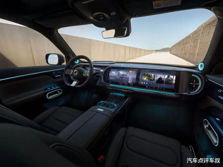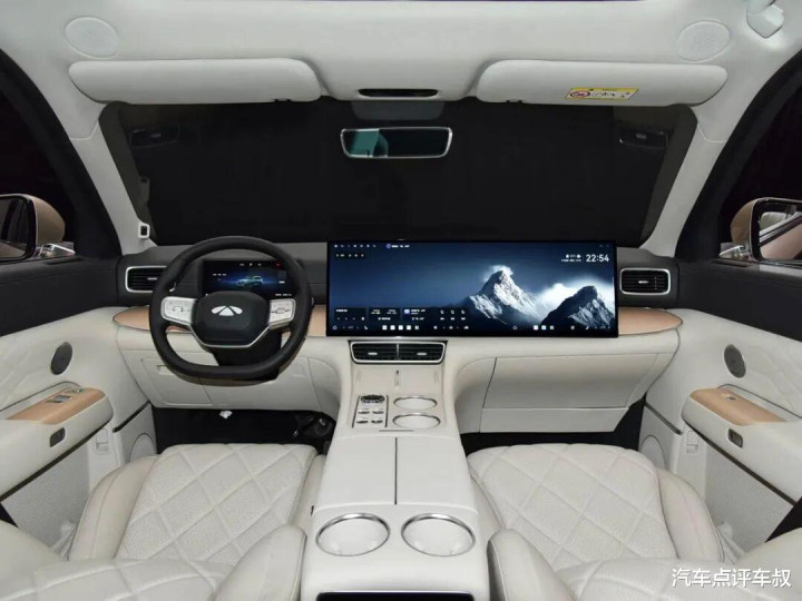 内饰方面,中控屏与副驾屏采用一体式的6K贯穿屏,尺寸达30英寸,支持AI大模型语音助手,全车六个座位都能语音控制。液晶仪表盘独立设计,尺寸相对较小,不影响驾驶。此外新车还配备了AR - HUD。中控台采用大面积的软包材质,还配备256色的氛围灯以及三种香氛,全车配备23个扬声器。
