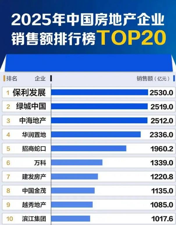 其中,保利发展2530亿元、绿城中国2519亿元、中海地产2512亿元、华润置地2336亿元。